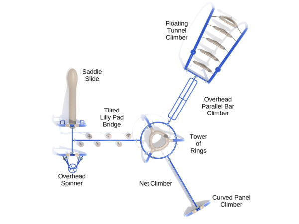 Features: Moonbase theme, progressive challenges, central tower, dual-access elements, balance training, diverse exit options