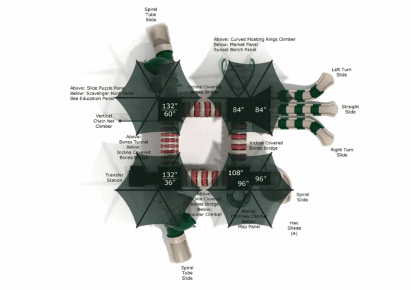 Ignite imagination with Azure Aurora, a vibrant playground packed with fun! Kids tackle the Boulder, Chimney, or Curved Floating Rings Climber, cross Bones Bridges, and engage with Bee Education and Scavenger Hunt Panels for collaborative play. Four thrilling slides—Spiral Tube and Turn—await, while Hex Shades keep it cool. Durable and dynamic, it’s an unforgettable play destination!