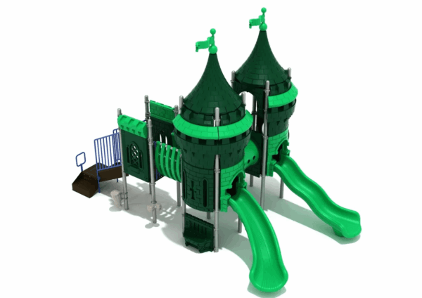 Discover the Jade Paradise, an enchanting compact playground featuring dual royal watch towers designed for maximum engagement. Despite its efficient footprint, this vibrant green play structure incorporates all essential activities for complete childhood development.