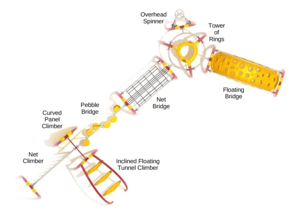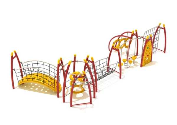 This demanding playground structure features unique awe-inspiring elements designed specifically for children seeking advanced challenges. The signature Floating Bridge stands as the main attraction – an arched structure with strategic hand and foot holes that rocks and tilts with every movement, creating an unprecedented play experience unavailable elsewhere. The dynamic motion adds excitement while demanding exceptional balance and coordination skills.